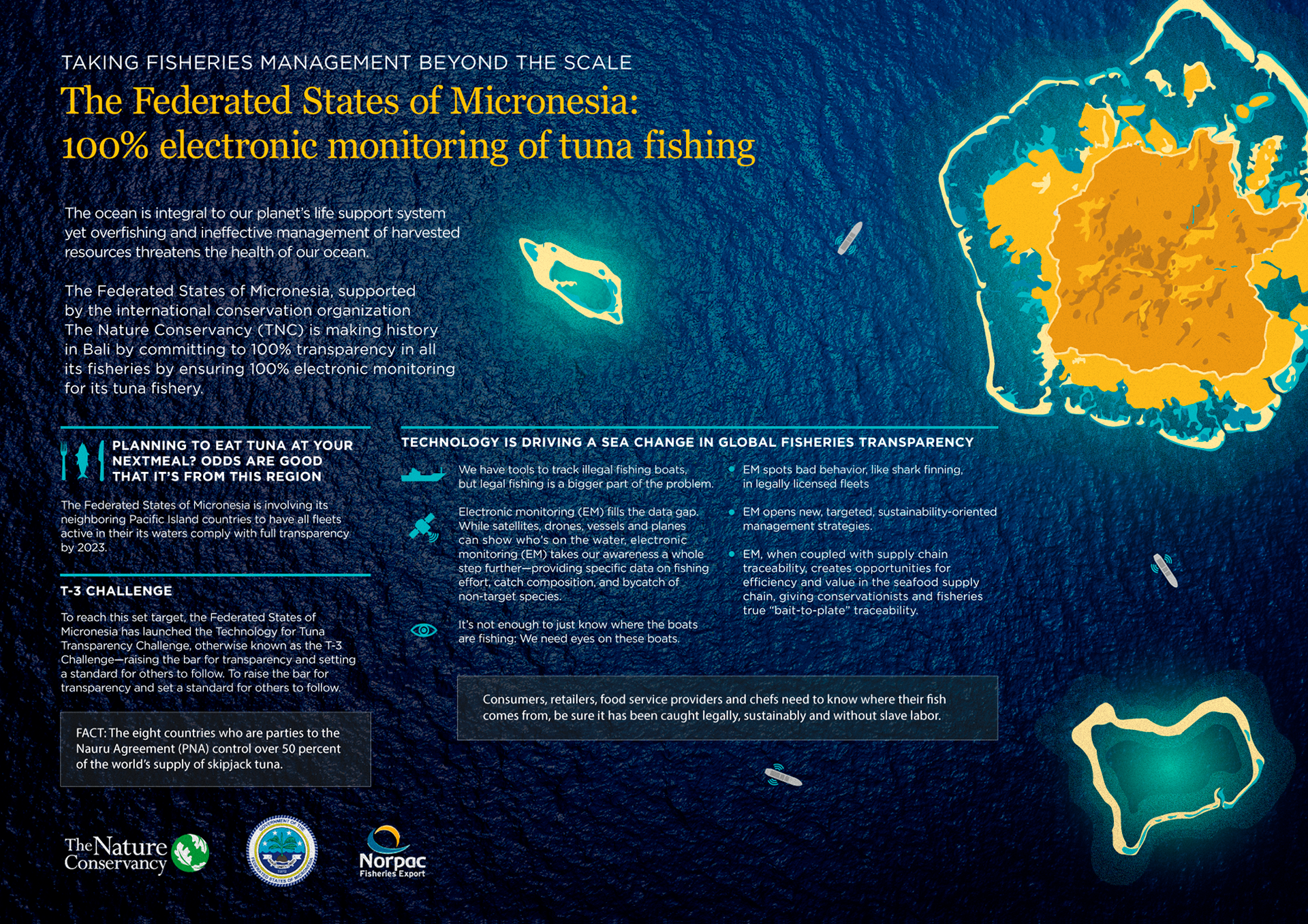 The Federated States of Micronesia, supported by The Nature Conservancy announced a shift to 100% electronic monitoring for its tuna fishery and wanted to challenge its fellow Pacific Island nations to follow suit. At Our Ocean conference they held a dinner for Policy Makers for other Pacific countries and announcing this project.
